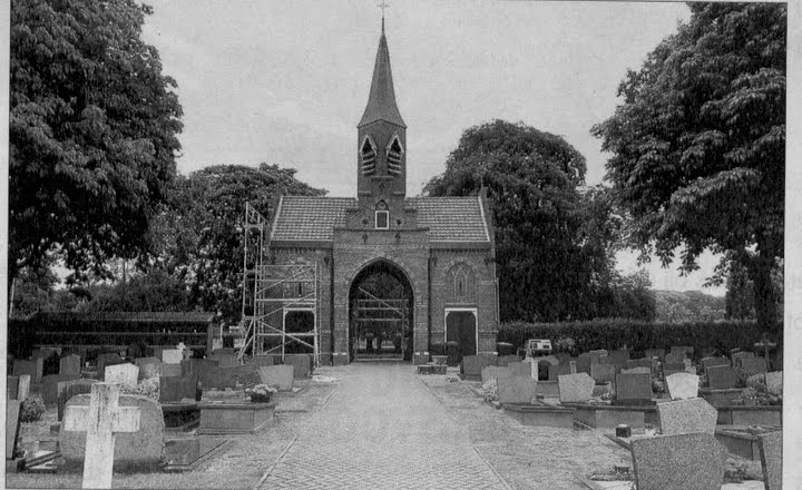 Bouw van de ingangspoort en toren op het Rooms-Katholieke kerkhof